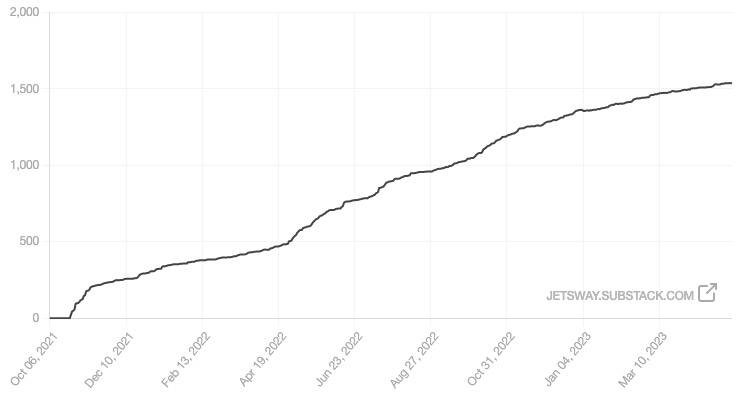 I also just wanted to thank you all again, first for the well-wishes to myself and the family after the birth of our second child this weekend. Both Mum (Katie) and Baby (Millie) are doing well. Secondly, for your continued support of TJW, we’ve now passed over 1,500 subscribers as you can see in the chart above. Onwards to 2,000.