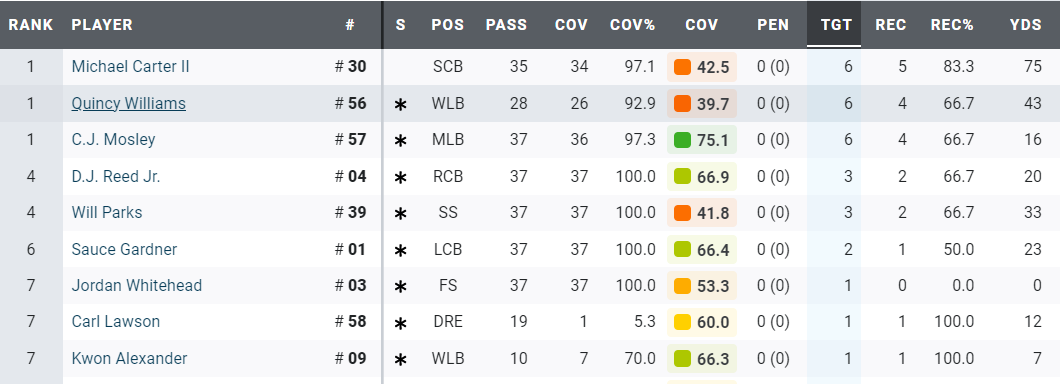 Carter had the toughest assignment with Kirk and that showed with him allowing 83.3% of passes to be completed. Sauce had another shut-down game where he allowed a single catch for 23 yards. Lawrence played pretty safe on Thursday, so there wasn’t a huge amount of opportunity for the Jet’s defensive backs, and while they bent they didn’t break.