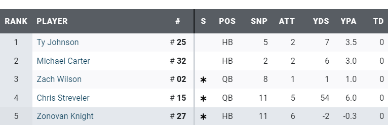 In those conditions the Jets running backs combined for just 10 attempts, that’s just unacceptable game planning. Part of that is on MLF and part of that is on Zach, if you can’t move the ball through the air, why would Jacksonville take defenders out of the box? Streveler totaled 15 yards after contact, the other four players on this list combined for just 10 yards after contact with a combined 3 missed tackles forced. Really it’s not very good at all.