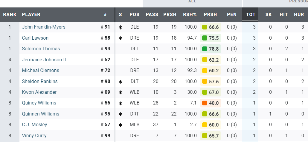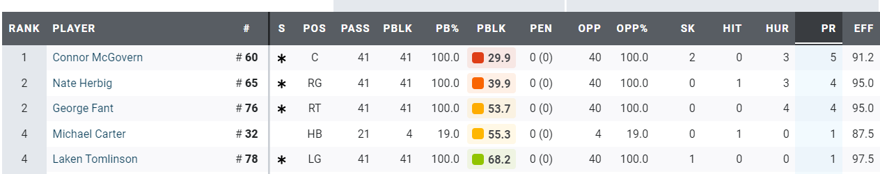 The one lineman you won’t see on this stat sheet is Duane Brown and that’s because the Jets left tackle allowed 0 pressures. Connor McGovern continues to struggle with 5 pressures allowed and 2 sacks, CMG has been largely good for the Jets but he’s having a very difficult end to the season, which is bad timing for him considering he’s entering free agency.
