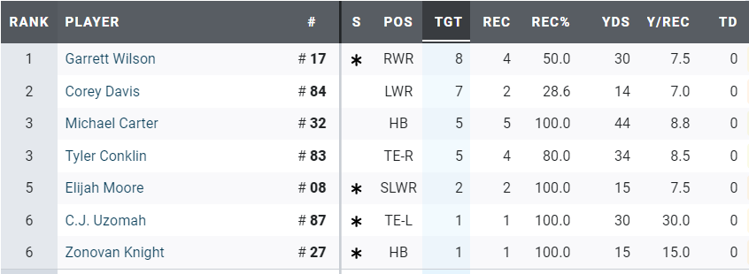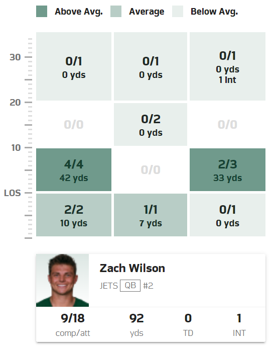 Unfortunately, a 50% completion for under 100 yards isn’t going to cut it and although Coach Saleh didn’t call it a benching, it was a benching. Zach completed just 25% of passes when under pressure, including that interception with the 2nd quarter expiring. Wilson was blitzed on 33.3% of his dropbacks and his time to throw was again on the wrong side of 3 seconds at 3.09.