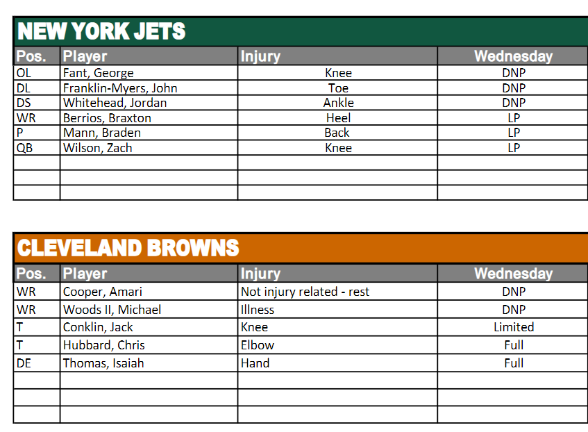 Let’s start with the Jets and Browns injury report from yesterday. In terms of the Jets we can all relax about George Fant, he was getting a veteran rest day, and the early expectation is that JFM will play on Sunday. However, there is real concern that Jordan Whitehead will miss the game, those fears were intensified when the Jets announced they’d signed Will Parks to the active roster from the practice squad. They also signed punter Ty Long to the practice squad, I thought it was down to Mann’s performance but seeing him limited with a back injury, maybe it’s just a contingency plan. Berrios should be fine and it was good to see Zach back, if just in a limited fashion…all we want to see is him trending in the right direction.