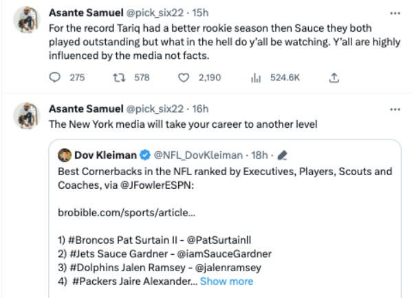 Asante Samuel woke up yesterday and chose jealousy and violence as his food for the day. He started by taking a pop at Sauce Gardner and ended by arguing with Darrelle Revis.