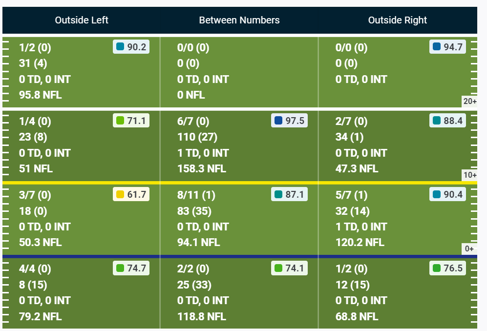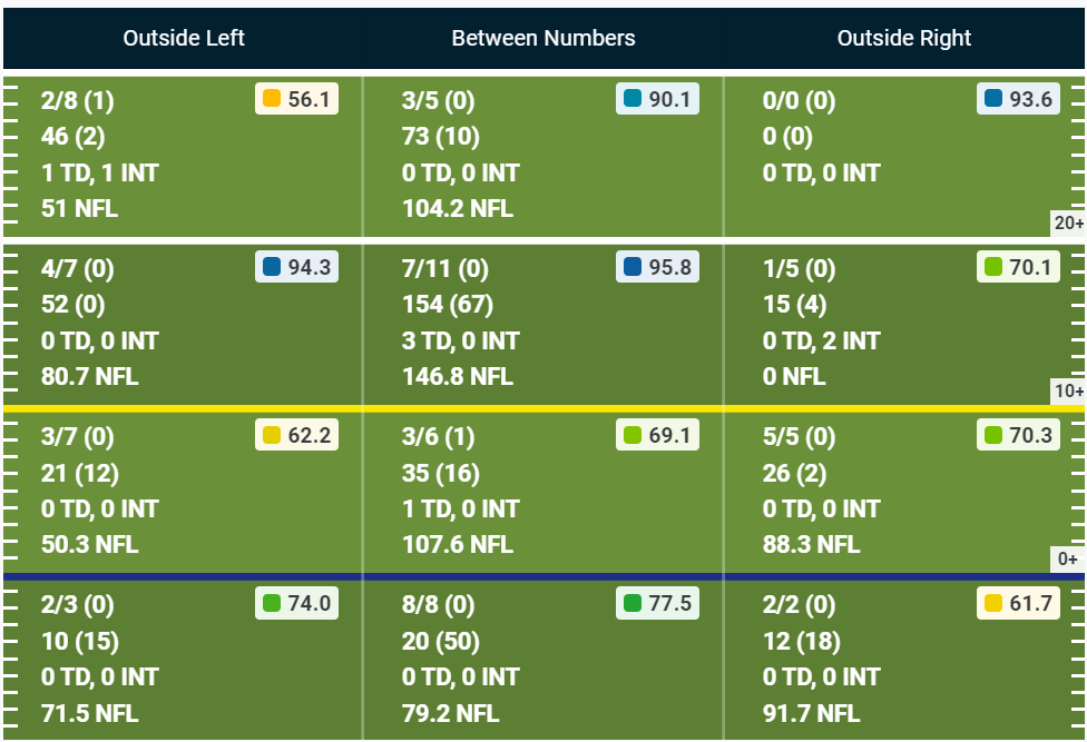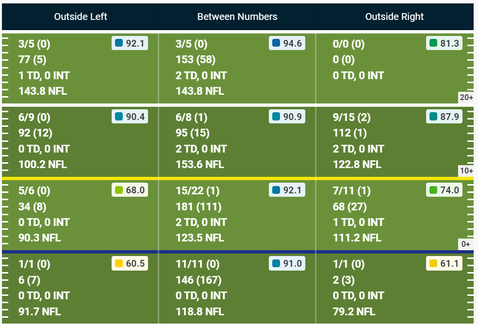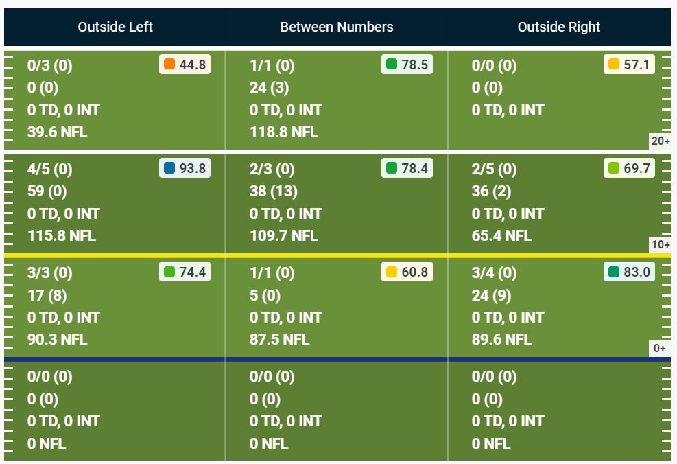 Now let’s compare that with how the Jets are using Elijah Moore so far this season. You’ll see that Moore only has 5 targets over the middle of the field, yet he’s caught 4 of them. Outside of the deep numbers of 1/4, and the intermediate right numbers of 2/5, Moore is doing a job everywhere else.