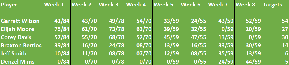 Denzel Mims basically came in and took on the role of Corey Davis. If you look at the week five snaps which are based on 59 overall offensive snaps, Mims played almost the exact same as Davis, so the theory that Moore only played 10 snaps because they wanted to get Wilson on the field next in place of Corey doesn’t hold much water, Wilson did play a season-high snap %, but have no doubt about it, Elijah was being punished. Even if the Jets wanted to switch Wilson and Moore so that Wilson was the dominant receiver, Moore should have still had around 30 snaps in that game instead of the 10 that he saw. Whether you agree with the punishment or not, that’s a mismanagement of resources.